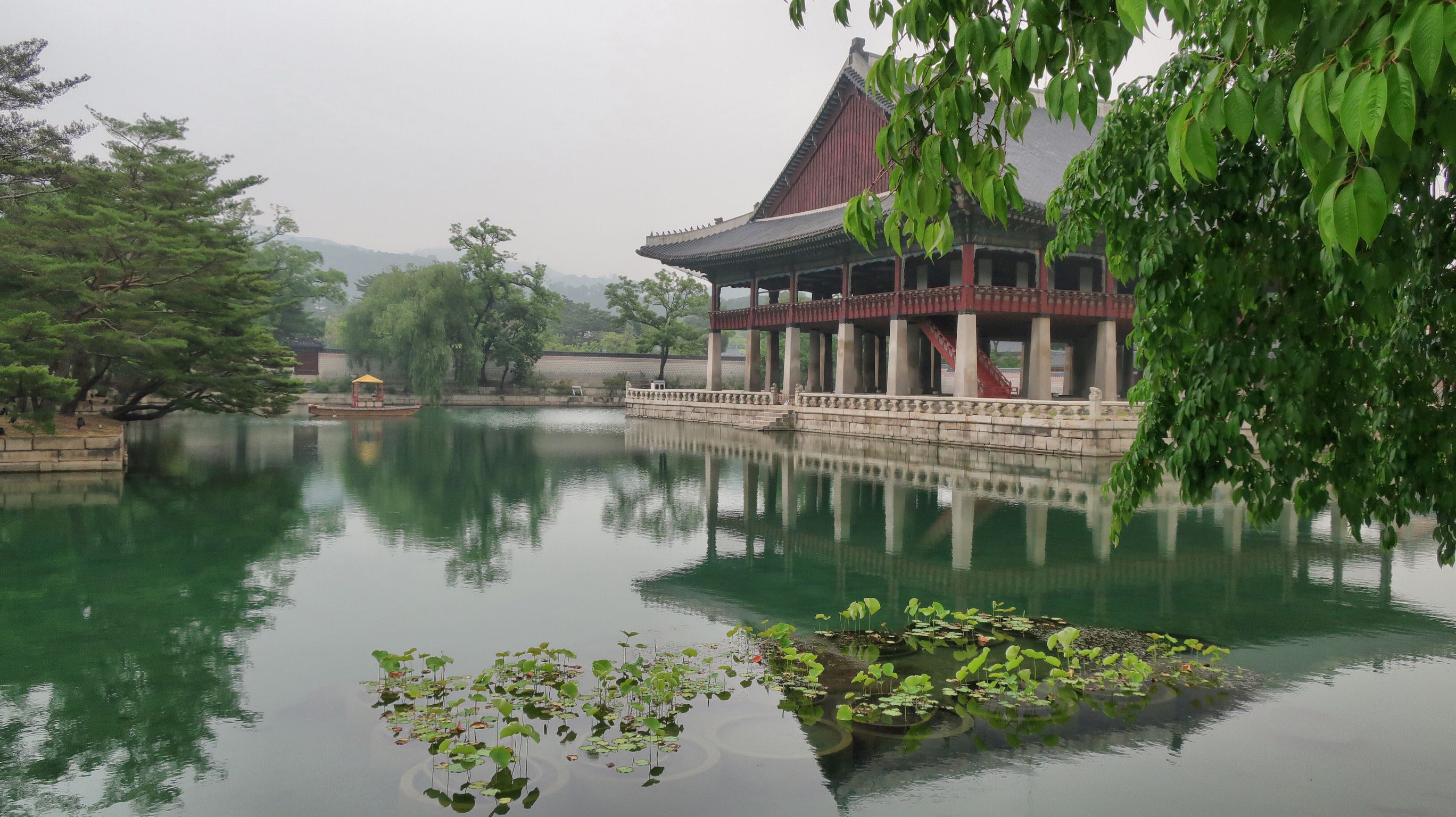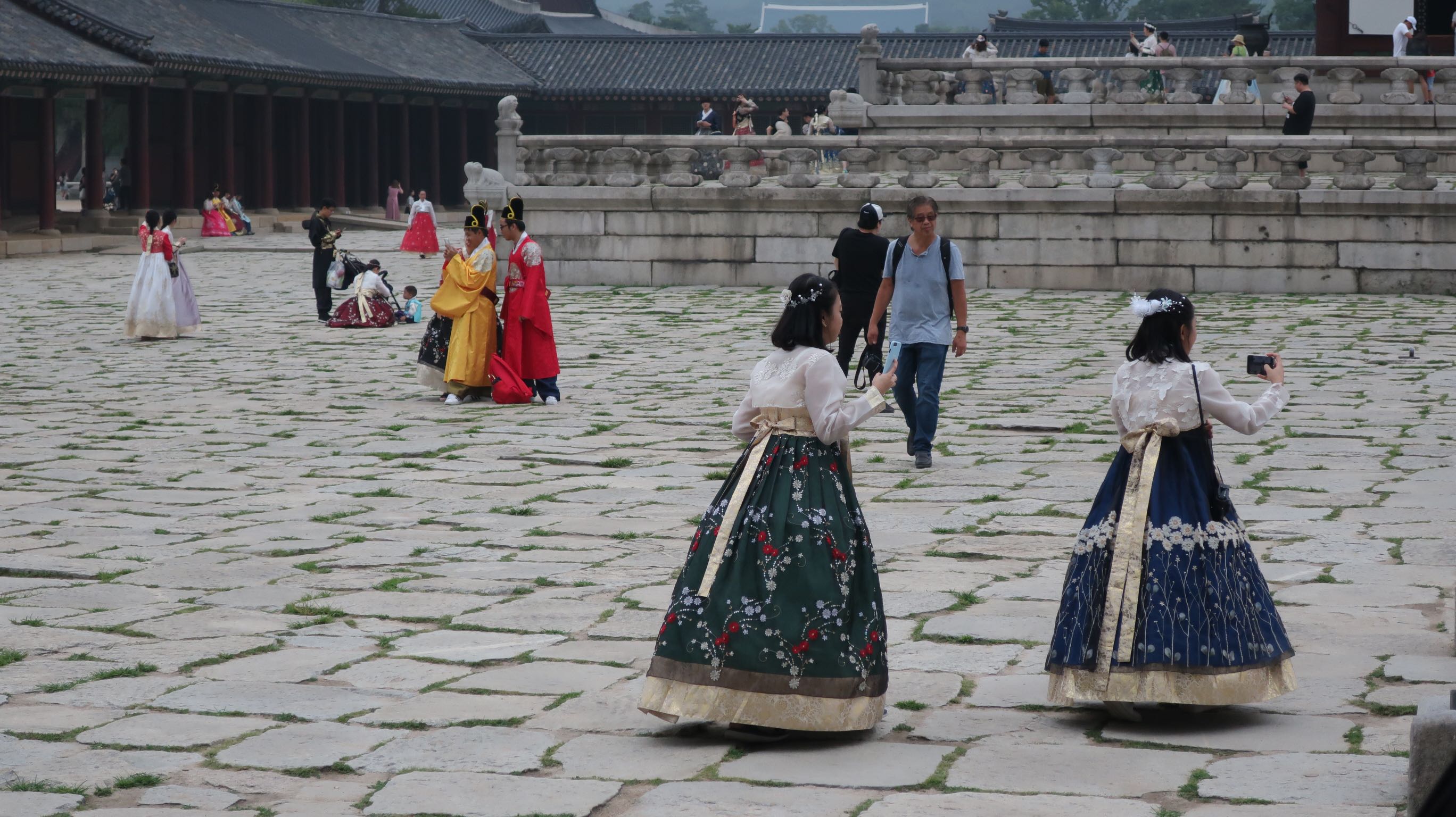 Ces palais ont été construits sous l’ère Joseon, longue dynastie entre le 14eme et le début du 20eme. Mais tous sont reconstruits récemment car détruits sous plusieurs occupations japonaises. Le palais est finalement une petite cité interdite avec de nombreux pavillons séparés par des enceintes intérieures. On se croirait dans un film historique : pratiquement tous les coréens visitent en costumes d’epoque loués pour 2h. Comme si nous allions parcourir Versailles en habit de gens de la cour.