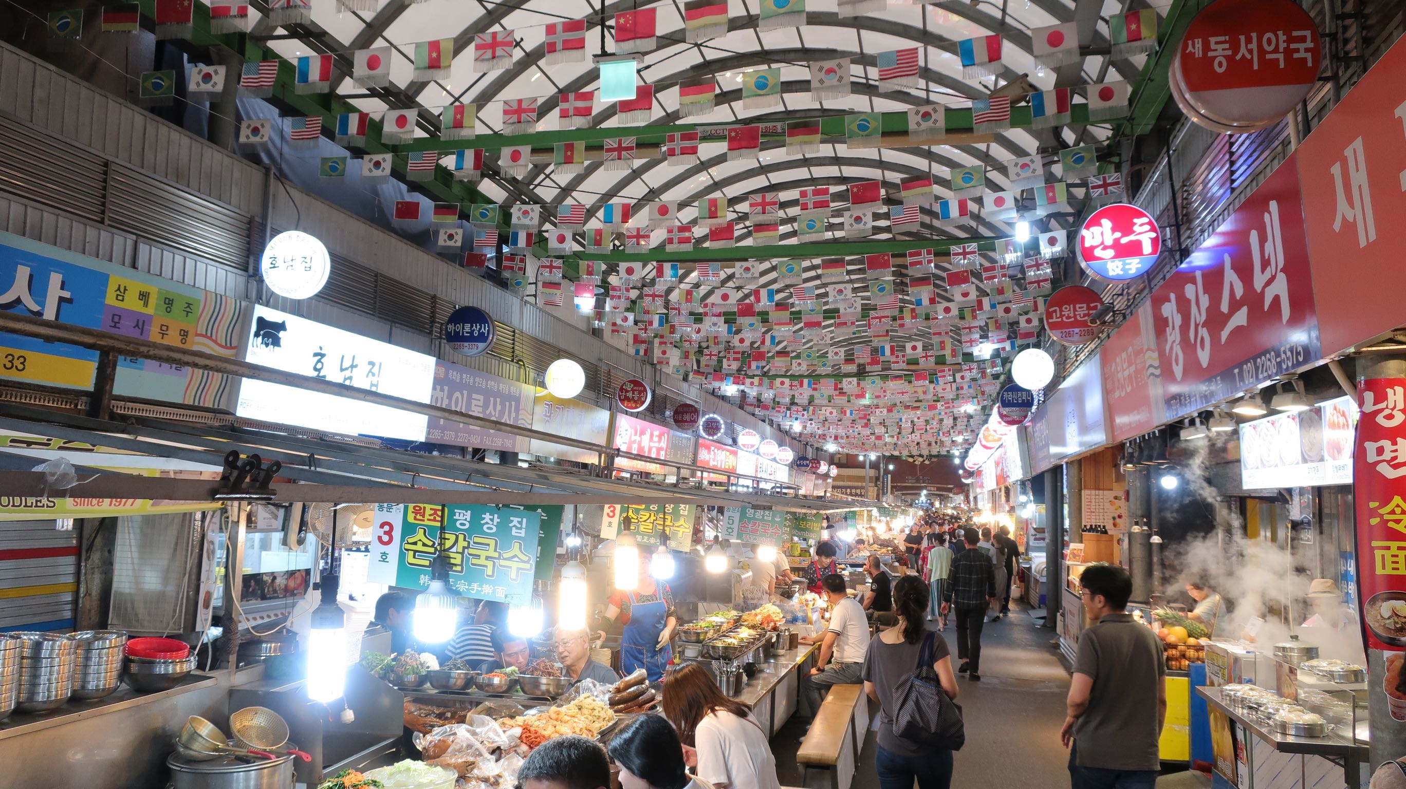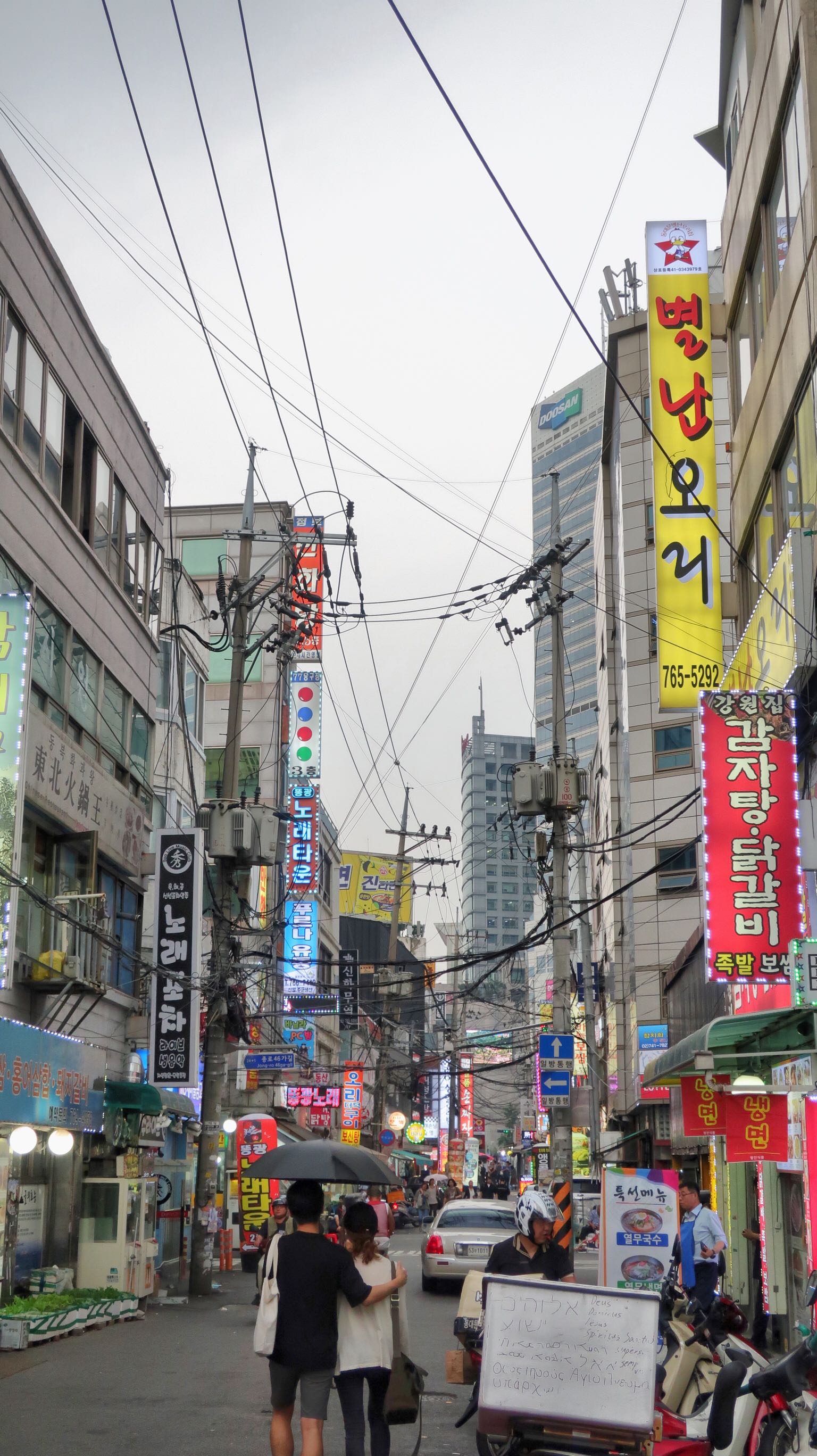 Le soir : un petit Bibimpap dans le marché du coin. C’est le plat national : mélange de riz et de légumes émincés avec de l’algue. Pour les coréens : en plus de la sauce piment. Et oui ! La cuisine coréenne est une des plus relevées du monde…