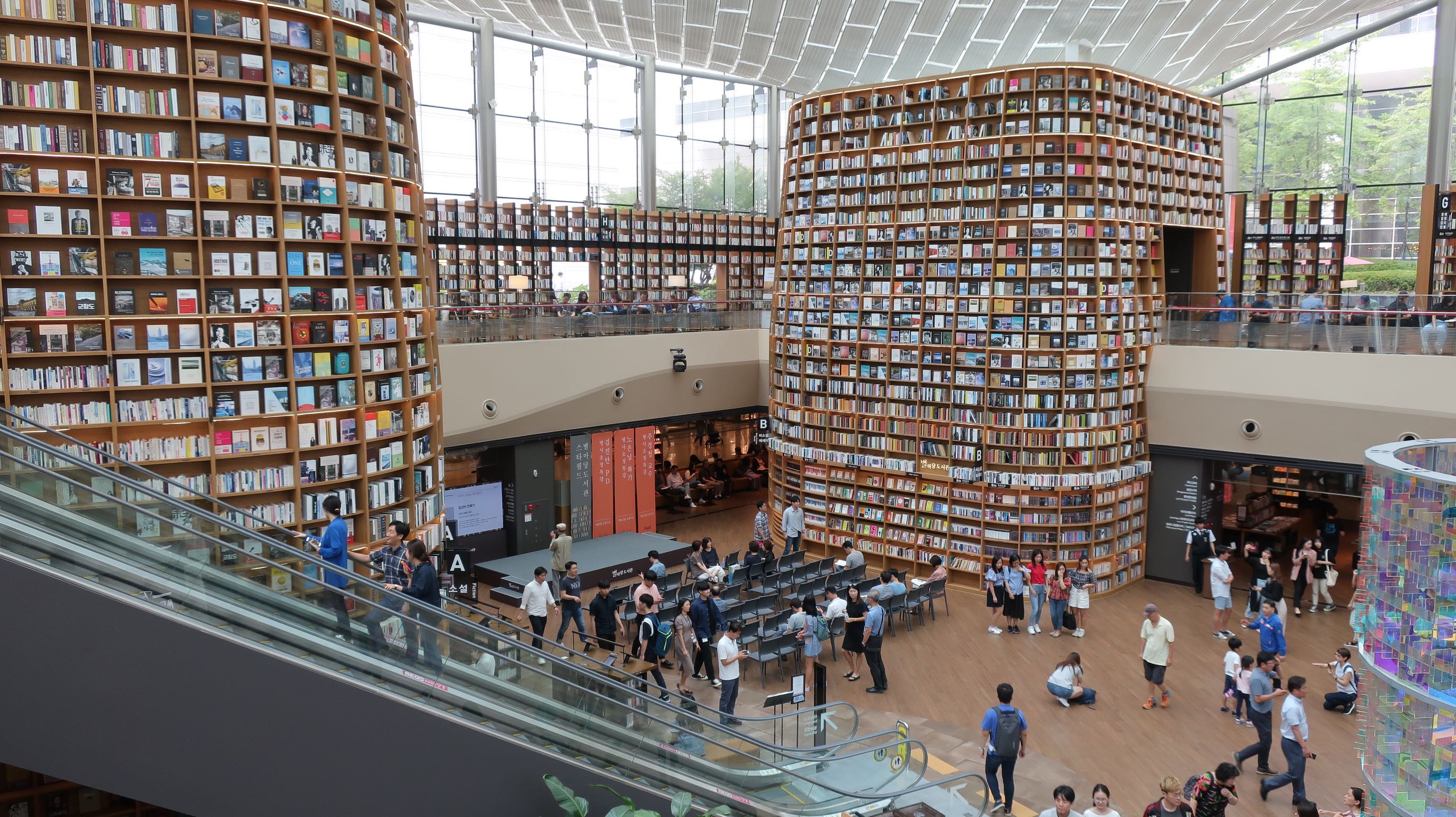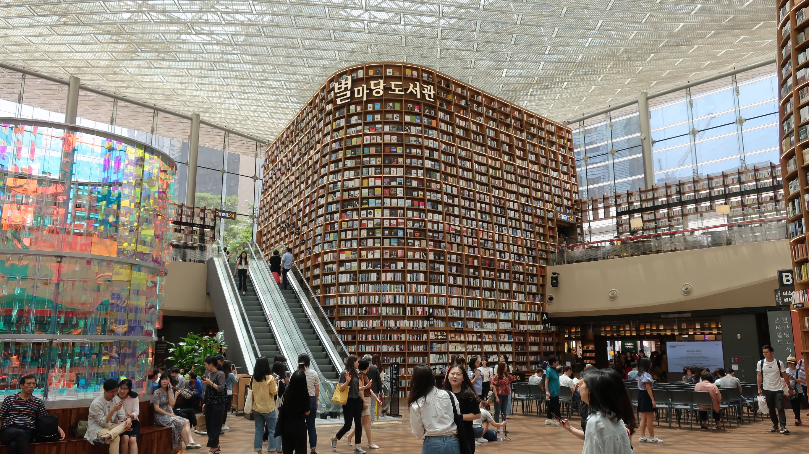 Qu’on trouve une des plus incroyables bibliothèques publiques du monde : la starfield library, au cœur du centre commercial Coex. Les espaces sont imbriqués avec les boutiques, pas de délimitation, pas d’antivol, un atrium gigantesque.