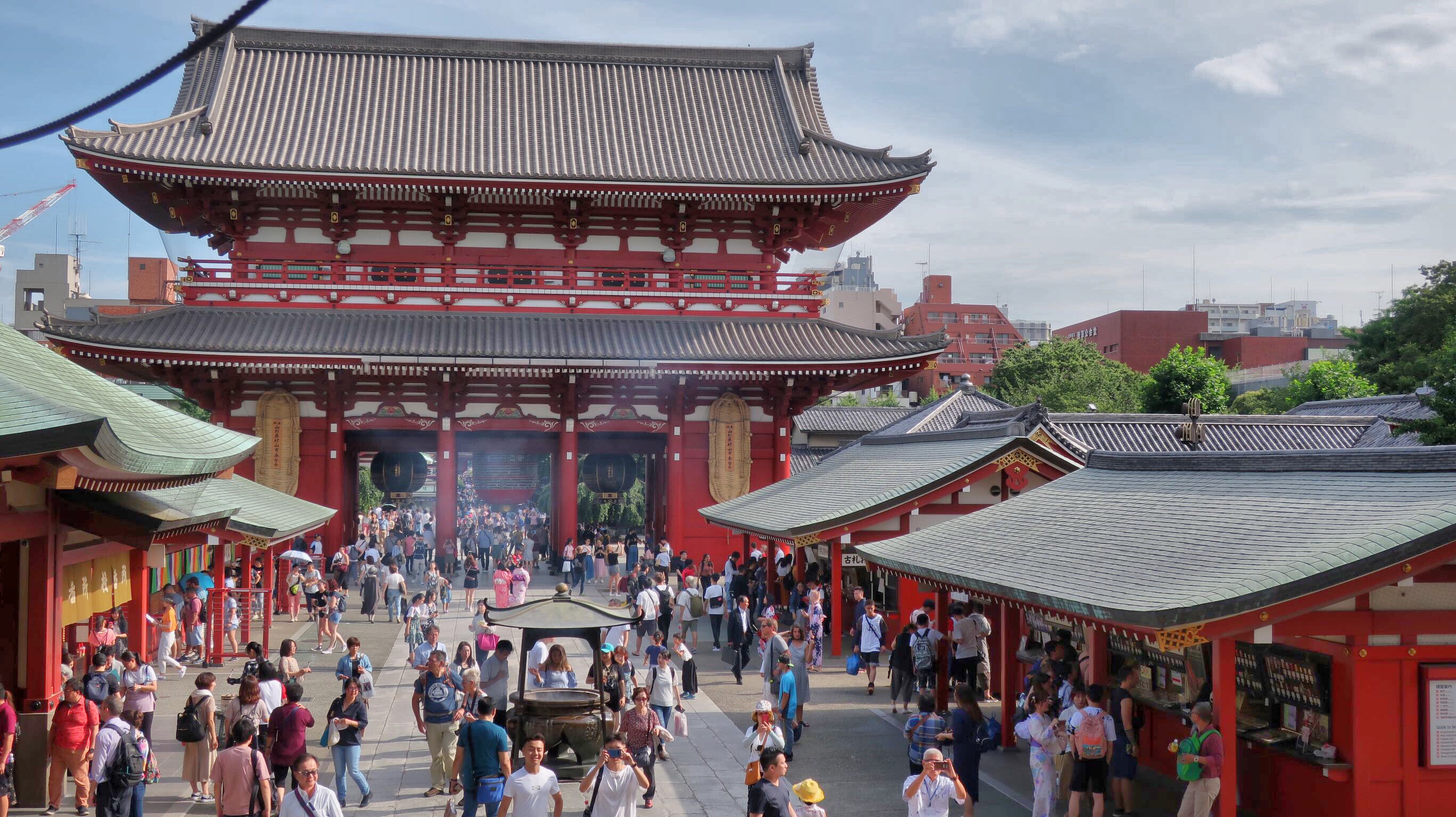 Déambulation dans le quartier autour de la petite maison ancienne que nous avons louée au pied de la Sky tree tower, tour de télécommunication construite en 2011, culminant à plus de 600m de hauteur. En franchissant la rive de la Sumida, le fleuve traversant Tokyo, nous nous retrouvons à Asakusa, quartier traditionnel bondé de touristes asiatiques car on y trouve le Senso-Ji, plus vieux temple bouddhiste, et plus populaire, de Tokyo. Comme dans tous les lieux sacrés de la terre, on franchit, pour y aller, une longue artère bordée de marchands du temple. Les commerçants sont réputés les moins sympathiques du pays !